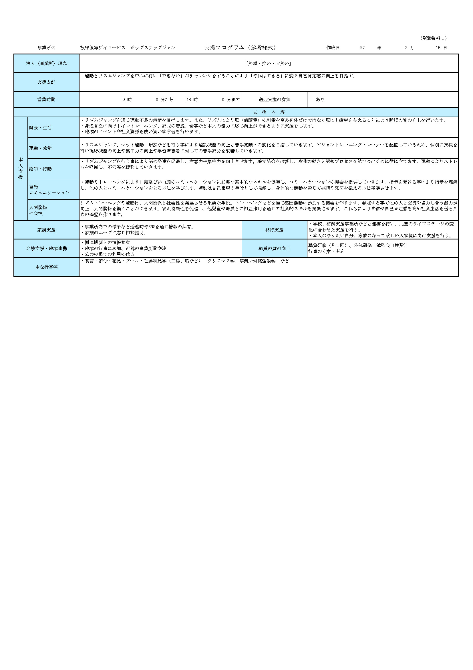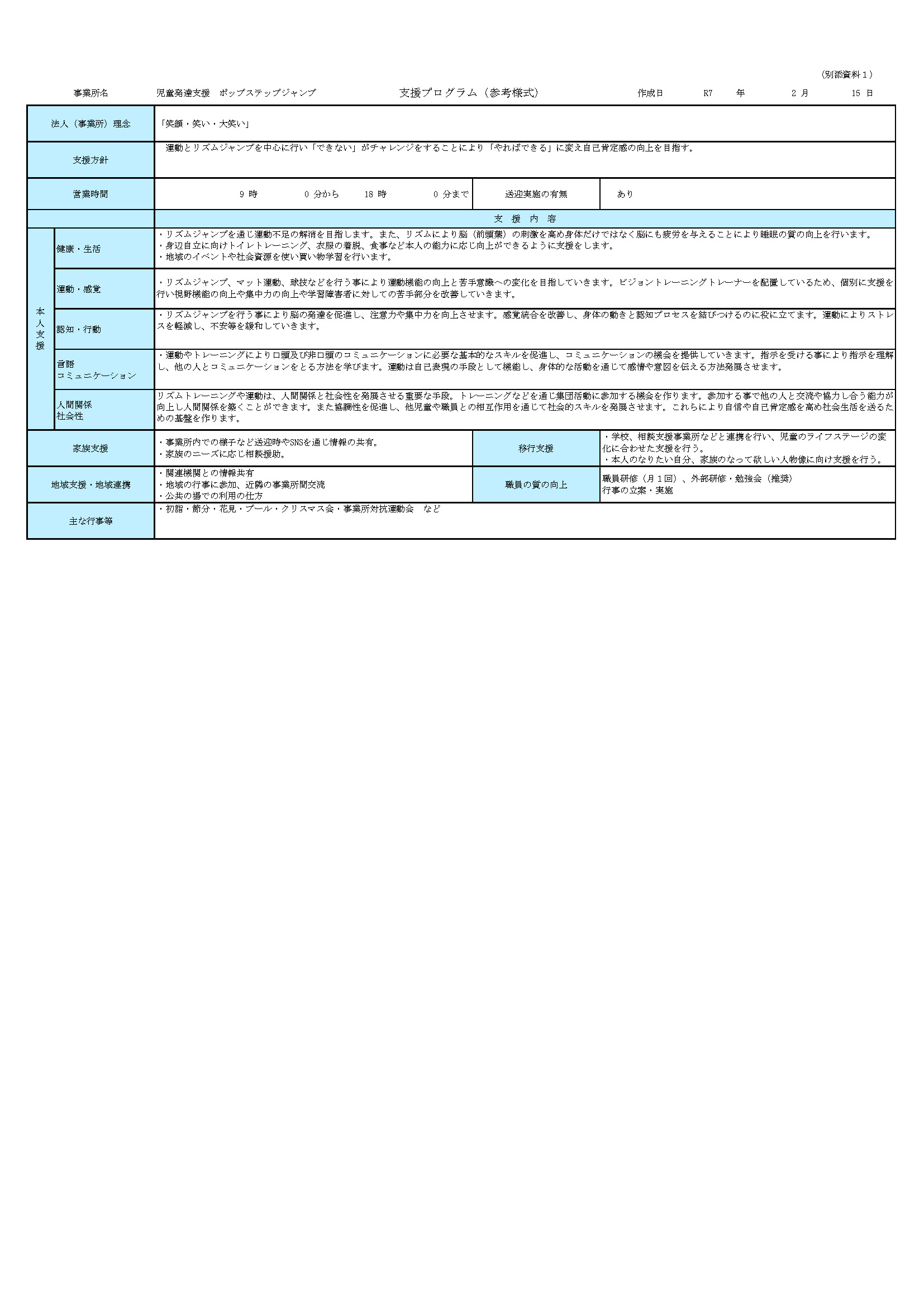 | 令和7年度 情報公開資料 | 株式会社未来・プロジェクト 児童発達支援自己評価・保護者評価 ・(別紙1)従業者向け評価実施シート 株式会社未来・プロジェクト 自己評価結果報告書 |